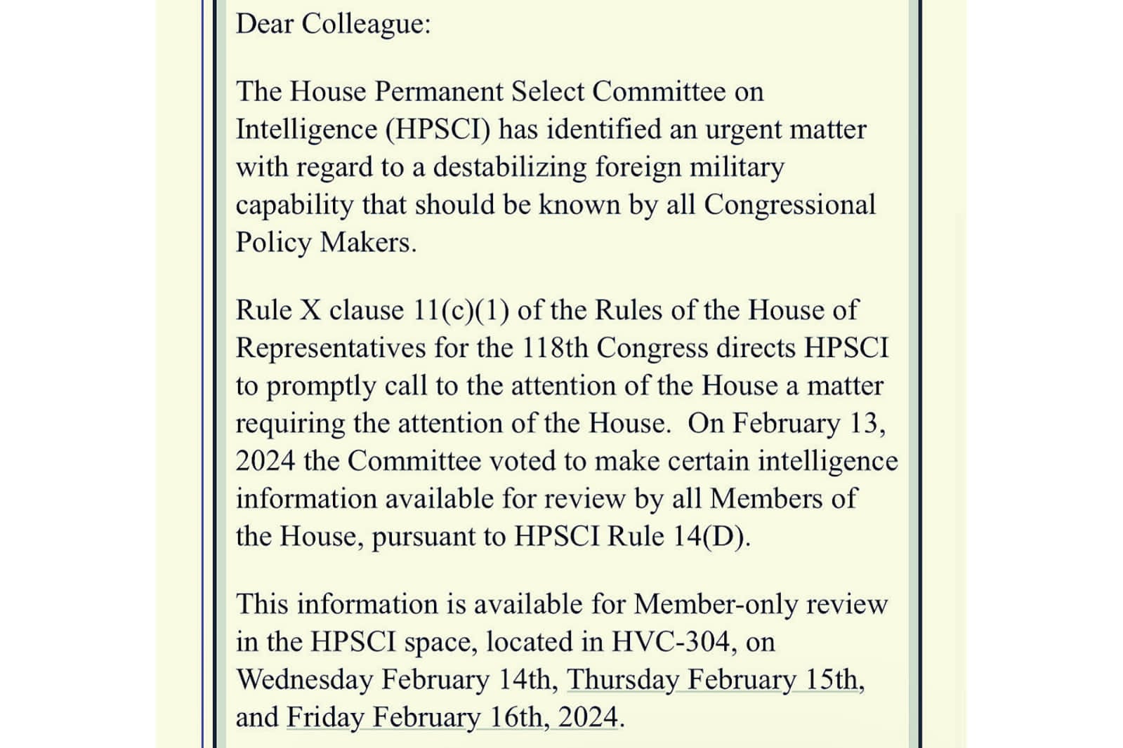 <p id="Recent developments have sparked urgent concerns within the U.S. House Permanent Select Committee on Intelligence regarding a potential destabilizing foreign military capability. While specific details are yet to be disclosed publicly, the focus of the alert is on Iran and its purported nuclear weapons program.The committee has labeled the matter as urgent, signifying the gravity of the information. Congressional policymakers are expected to be briefed on the situation, heightening the sense of urgency surrounding Iran’s nuclear capabilities.